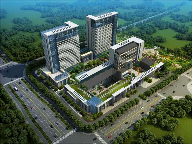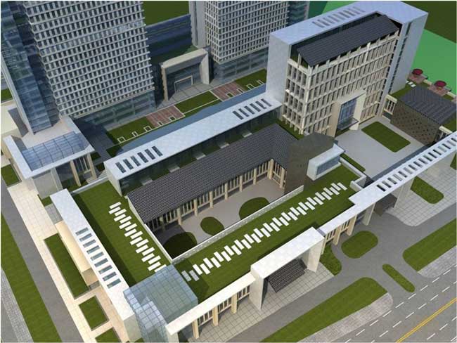 采用中国古典园林合院式布局。各个办公楼之间围合成半开放的院落,为办公提供一个很好的院落式景观,提高办公档次。办公建筑高度不同,错落有致,配合合院式景观,形成了一个很好的写意中国意境。同时也为地块增加人气,提升城市的品质,为城市的美化做出贡献。