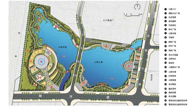 该方案以一环连两湖,三轴串八景,五区话古今,,动静两相宜的景观结构。共分为酒香礼颂、津渡迷踪、华汲岸雅、彩境盈风、柳孜遗韵、云影湖波六个部分。