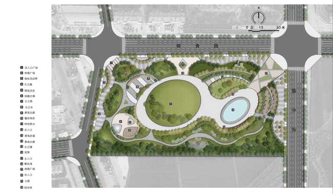 本方案设计采用现代的设计手法,以自然流畅的曲线和椭圆构图,营造疏密有致、多元复合的绿色开敞空间;外部空间缝合周边城市功能,提供便捷服务和临时休憩;内部空间充满艺术时尚元素,动静结合,意趣盎然;景观风格简约、大气,富有时代气息;植物丰富多样,体现四时美景;最终将公园建设成充满活力、韵味独具、自然和谐的“绿丘公园”——城市舞台、绿色氧吧。功能定位:城市休闲——嬉戏娱乐,健身养生,交流融通,文化展示——艺术时尚,生态环保,新城新貌,自然体验——绿丘花岛,植物多样,城市山林。