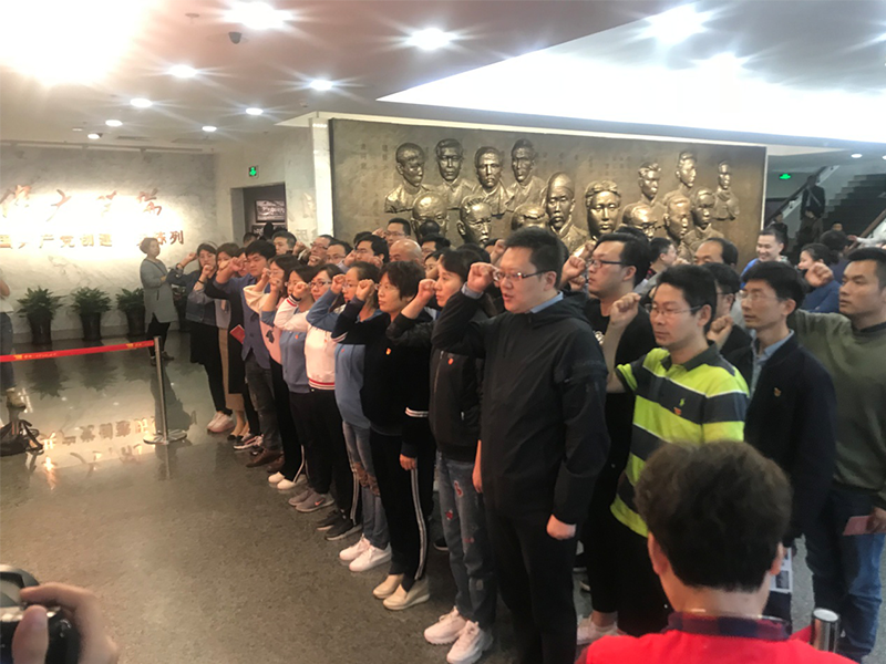 上海中共一大会址纪念馆,外墙青红砖交错,乌黑的铁门,庄严肃穆。展厅中李大钊、陈望道、张人亚……一个个光辉的革命先驱形象,以穿越时空的方式,在这里向参观者叙述他们的理想和信念。我们全体党员在宣誓厅面对鲜红的党旗,庄严的举起右手,重温了入党誓词。参观过程中,党员们认真听、仔细看、用心记,在一件件珍贵展品前流连,在一个个历史场景中思索,在庄严肃穆的氛围中默默体悟,感受到了中国共产党建党时的艰辛、革命先辈坚定的理想信念、以及面对困难与挫折时不忘初心砥砺前行的精神。